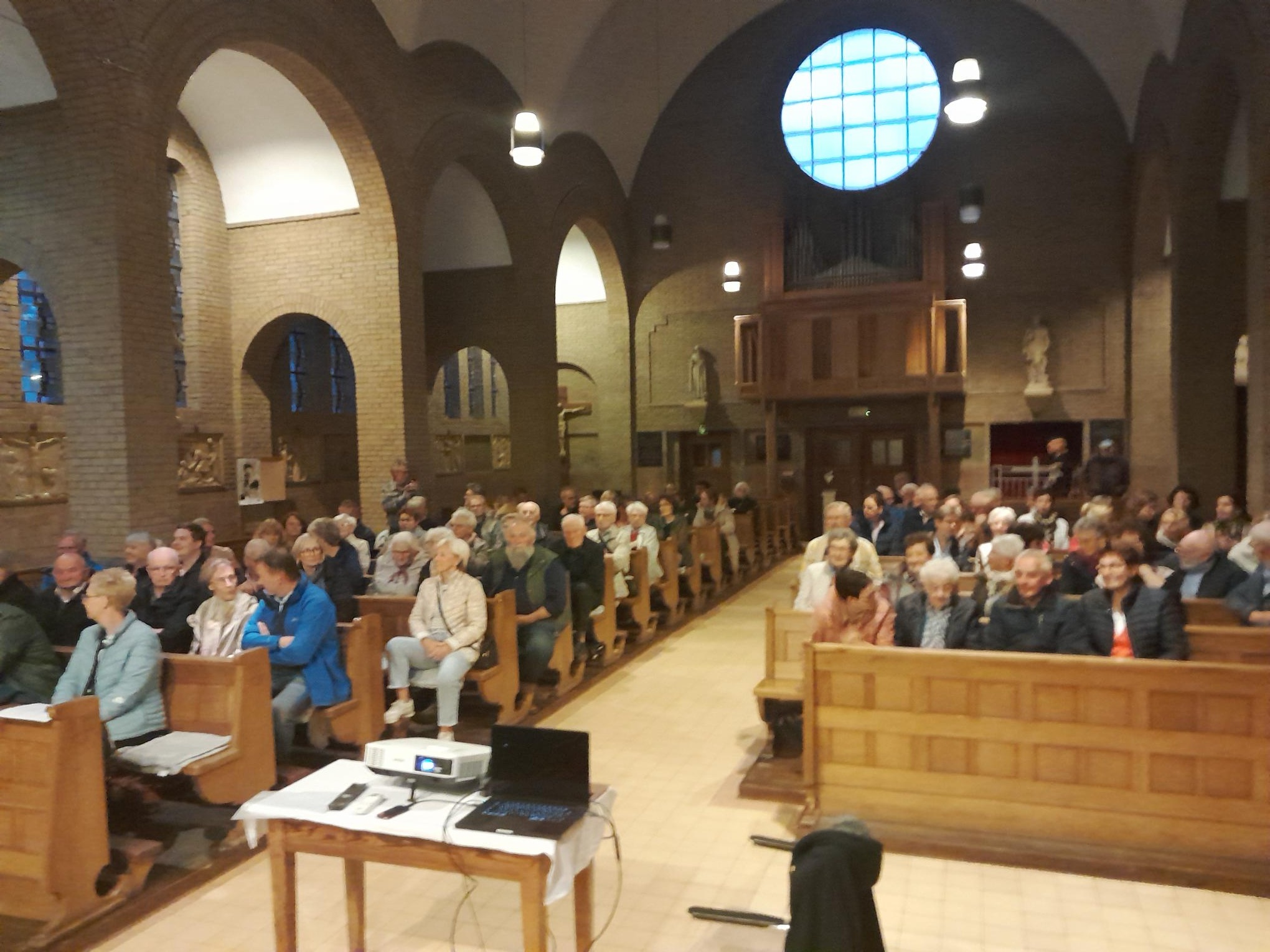 De kerk zat maandagavond 30 september goed gevuld door een gemêleerd gezelschap van ouderen en jongere bezoekers. Pastoor Amal van Altweerterheide zou jaloers zijn geweest.. Ook de media was van de partij.