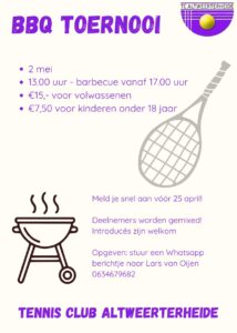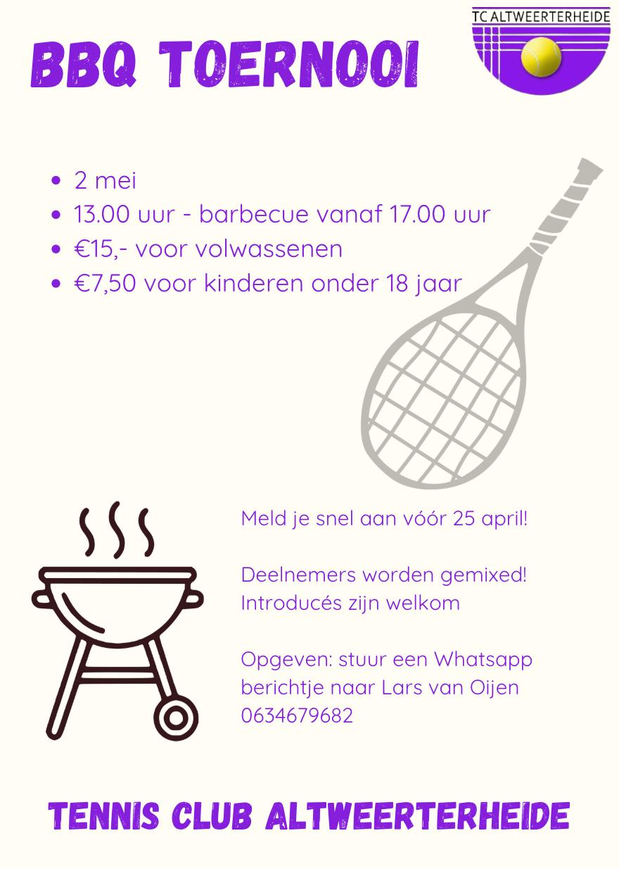 Op zaterdag 2 mei 2026 organiseert TC Altweerterheide een gezellig en sportief BBQ toernooi! Vanaf 13.00 uur ben je van harte welkom op de tennisvelden van TC Altweerterheide, gelegen op sportpark Op den Das.